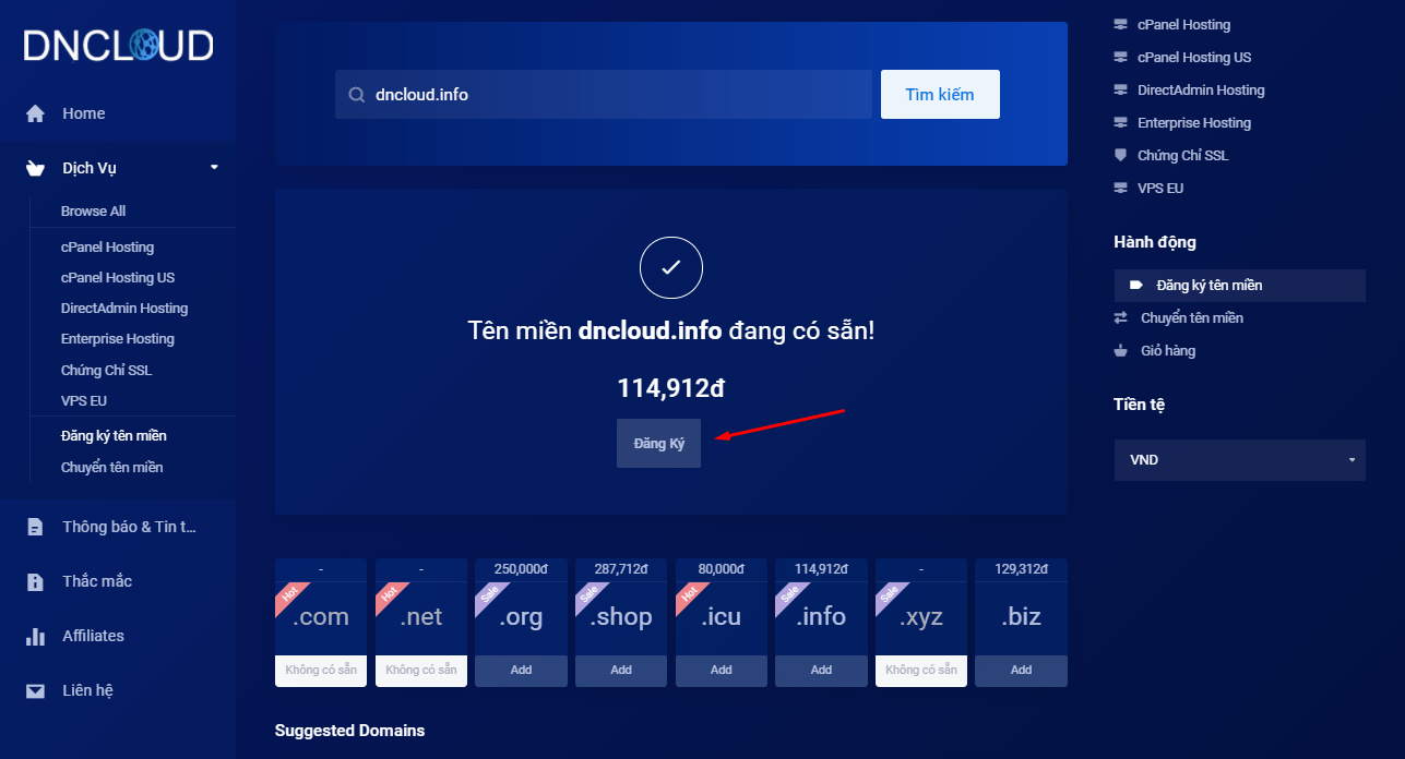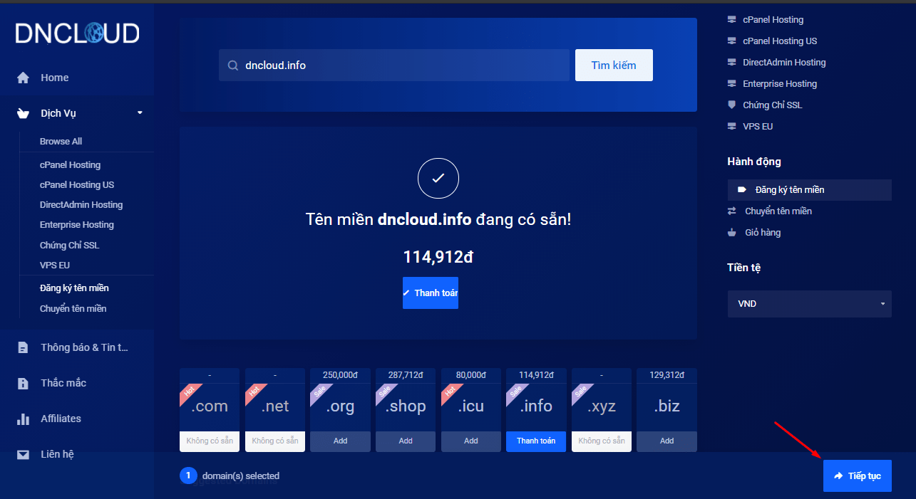 Tiếp bạn nhấp vào nút tìm ngay hệ thống sẽ chuyển bạn tới trang my.dncloud.net để tìm kiếm và đăng ký tên miền, khi bạn đã tìm thấy tên miền phù hợp hãy chọn nút đăng ký