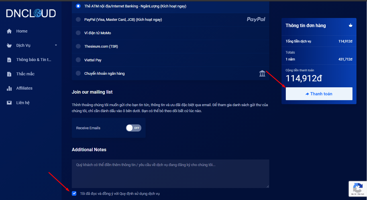 Bước cuối cùng bạn cần hoàn thành thông tin đăng ký tên miền và tài khoản tại my.dncloud.net sau đó bạn tiến hành thanh toán tên miền sẽ được kích hoạt.