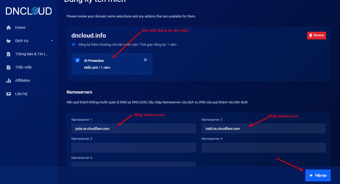 Tiếp theo bạn cần nhập Nameserver, mình khuyên bạn nên sử dụng nameserver tại CloudFlare để quản lý tên miền của mình dễ dàng và nhanh chóng hơn. Và DNCLOUD cũng miễn phí ẩn thông tin tên miền mình khuyên bạn nên chọn để bảo mật thông tin cá nhân hơn nha.