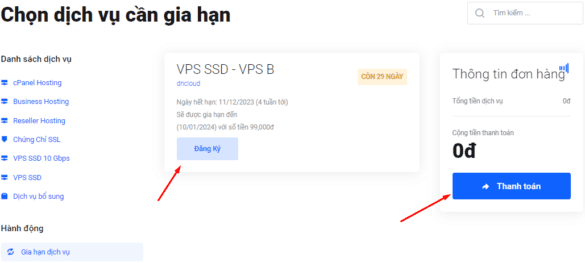 Tại đây bạn chọn dịch vụ bạn cần tạo hóa đơn gia hạn và nhấn nút Đăng Ký ngay bên dưới sau đó nhấp vào nút Thanh Toán ở bên phải.