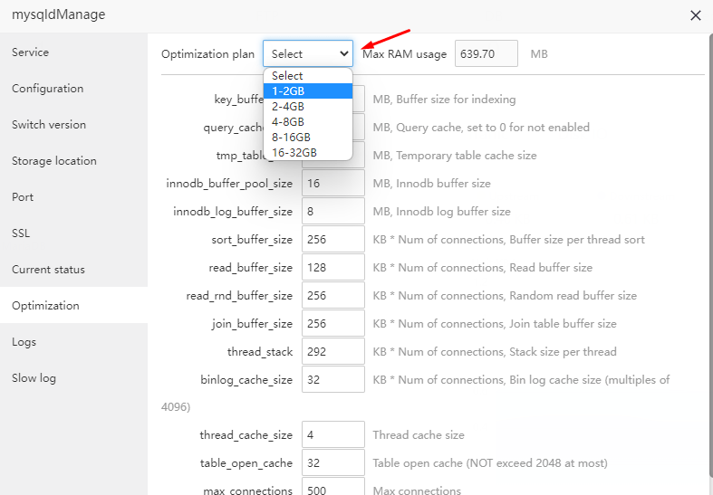 Tại mục Optimization bạn chọn mức ram tương đương với VPS của bạn đang dùng. VPS của mình 1GB ram nên mình sẽ chọn 1-2GB.